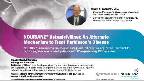 References: 1. NOURIANZ [package insert]. Kyowa Kirin, Inc., Princeton, NJ 08540. 2. Chen J-F, Cunha RA. The belated US FDA approval of the adenosine A2A receptor antagonist istradefylline for treatment of Parkinson’s disease. Purinergic Signal. 2020;16(2):167-174. 3. Isaacson SH, Betté S, Pahwa R. Istradefylline for OFF episodes in Parkinson’s disease: a US perspective of common clinical scenarios. Degener Neurol Neuromuscul Dis. 2022;12:97-109.